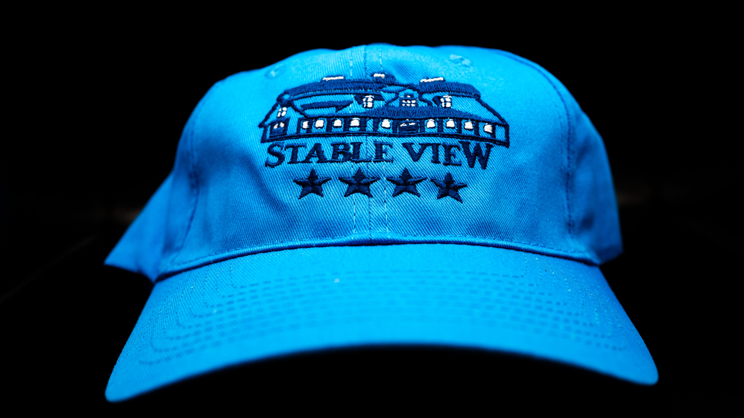 Bright Blue Stable View Velcro strap hat with navy blue logo.